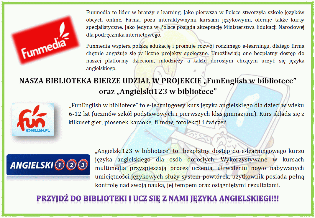 Jednym z narzędzi wykorzystywanych do poprawy efektywności przyswajania wiedzy jest interaktywna platforma edukacyjna funenglish.pl. Znajdują się na niej zdjęcia, piosenki, filmy i gry pomagające w nauce. Platforma funenglish.pl dostępna jest dzięki podjęciu współpracy pomiędzy FunEnglish.pl a Fundacją Rozwoju Społeczeństwa Informacyjnego. ramach współpracy, biblioteki zrzeszone w Programie Rozwoju Bibliotek, mają możliwość uzyskania bezpłatnego dostępu do platformy FunEnglish.pl dla czytelników w swojej bibliotece. Dostęp do platformy wspomaga Fundacja Orange udostępniając bibliotece Internet w ramach programu "Biblioteki z Internetem TP" (poprzez m.in. zwrot kosztów abonamentowych)