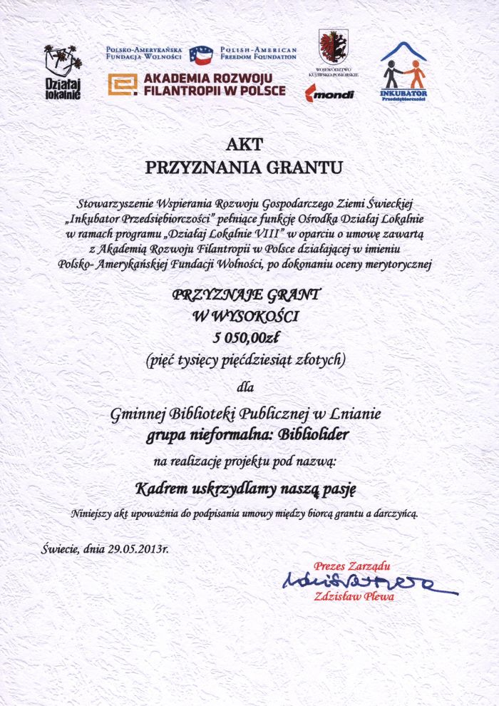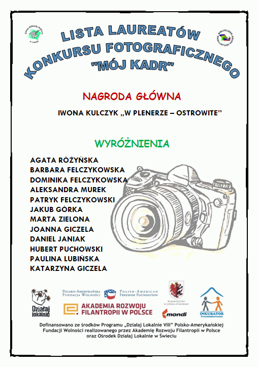 Kwota w wysokości 5.050,00 zł pochodzi od Stowarzyszenia Wspierania Rozwoju Gospodarczego Ziemi Świeckiej "Inkubator Przedsiębiorczości" pełniącego funkcję Ośrodka Działaj Lokalnie w ramach programu "Działaj Lokalnie VIII" w oparciu o umowę zawartą z Akademią Rozwoju Filantropii w Polsce działającej w imieniu Polsko-Amerykańskiej Fundacji Wolności. "Kadrem uskrzydlamy naszą pasję" to program działań, który obejmuje m.in.:
