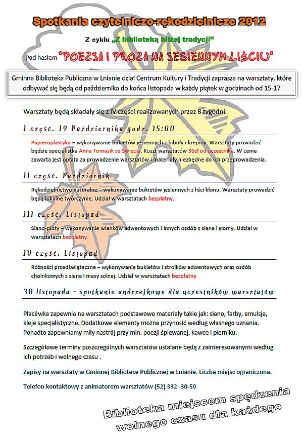 Od października 2012 r. odbywają się w bibliotece warsztaty czytelniczo-rękodzielnicze sezon jesień 2012, - wiosna 2013 w ramach III i IV edycji spotkań "Z biblioteka bliżej tradycji".