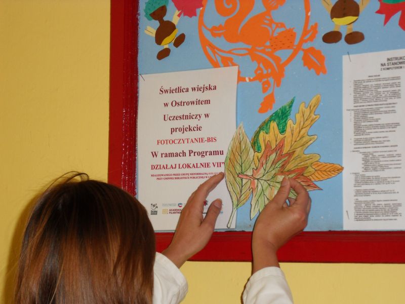 20 września odbyły się warsztaty fotograficzne w miejscowości Ostrowite. W świetlicy wiejskiej z grupą zainteresowanych fotografią omówiono projekt Fotoczytanie-Bis oraz oznakowano świetlicę zawieszając na tablicy informację o partnerstwie w projekcie. Zaprezentowano również zdjęcia z poprzedniej edycji konkursu fotograficznego omawiając na ich podstawie zasady tegorocznej edycji "Jesień czyta".